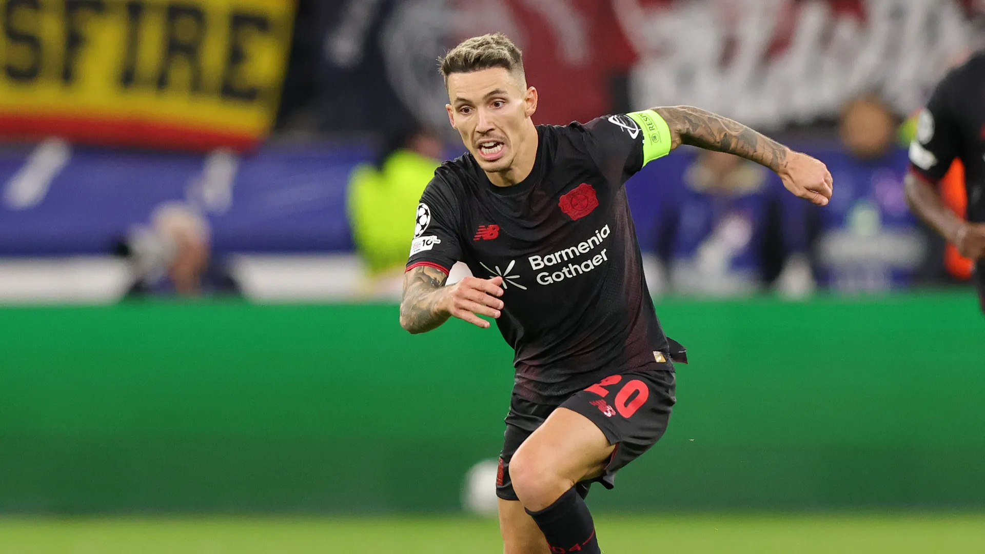 Leverkusen con el camerunés Kofane como punta central, Tillman y Ben Seghir en apoyo. En las bandas están Vázquez y Grimaldo, en el centro del campo Andrich hace pareja con García.