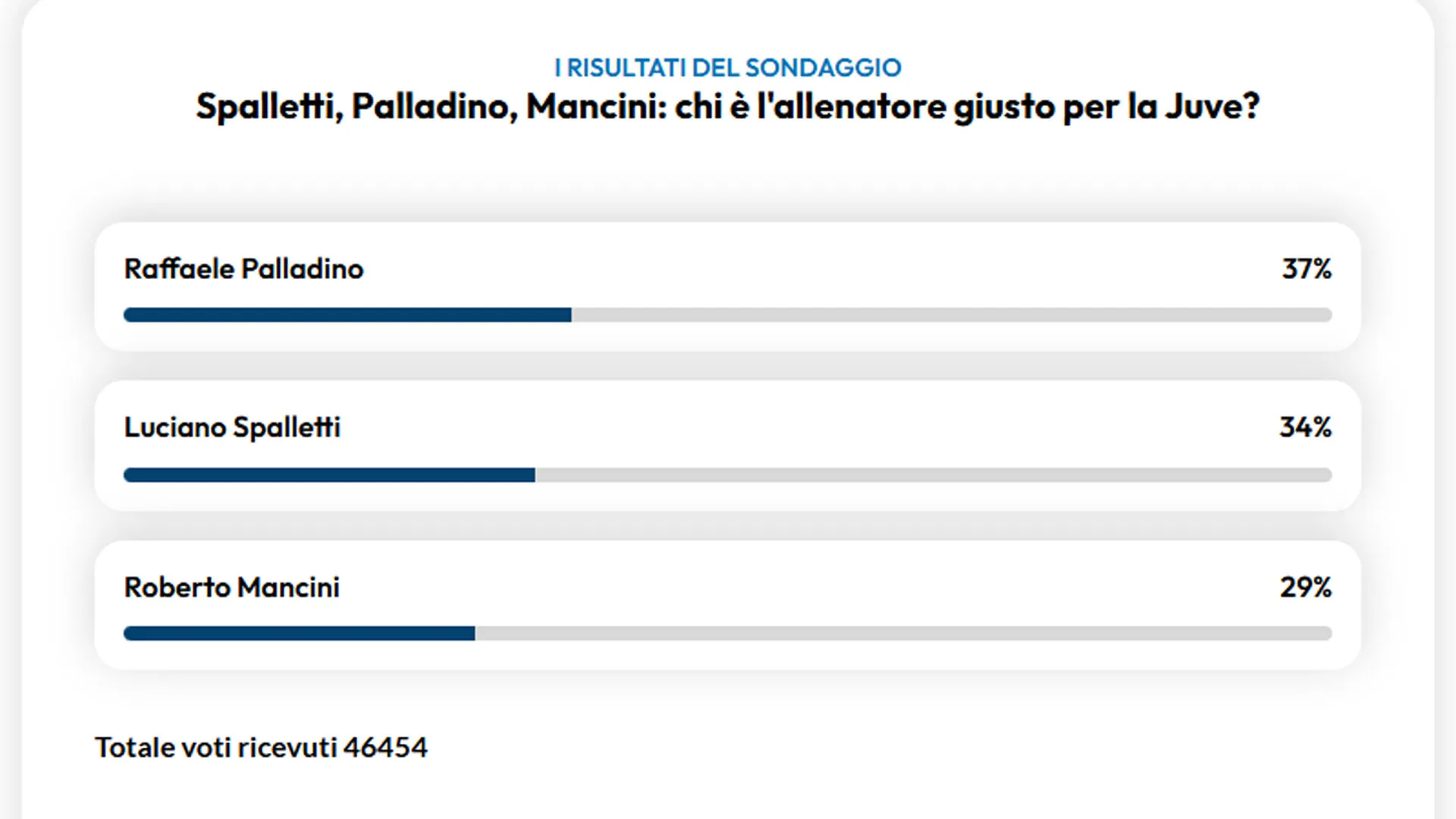 Se presentaron tres nombres, y el ganador no fue el ex seleccionador nacional Luciano Spalletti, que pronto será anunciado como nuevo timonel del equipo piamontés: tuvo que conformarse con el 34%, mientras que Raffaele Palladino convenció al 37% de los 46.454 que habían votado a las 9.30 horas del jueves. El tercer puesto fue para otro ex seleccionador, Roberto Mancini, campeón de Europa con Italia en 2021, que se detuvo en el 29%.