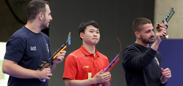 En pistola de aire comprimido de 10 metros masculina, plata para Maldni y bronce para Monna, oro para el chino Xie.